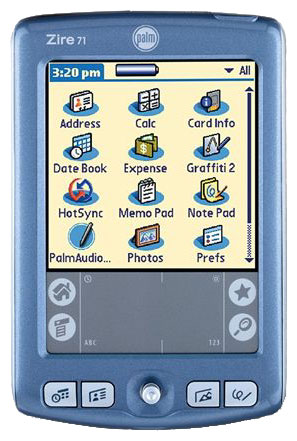 Palm OS 3, 160x160, Motorola DragonBall EZ 16 МГц, 2 Мб RAM, 2 Мб ROM, вес: 170 г, 81x119x18 мм.